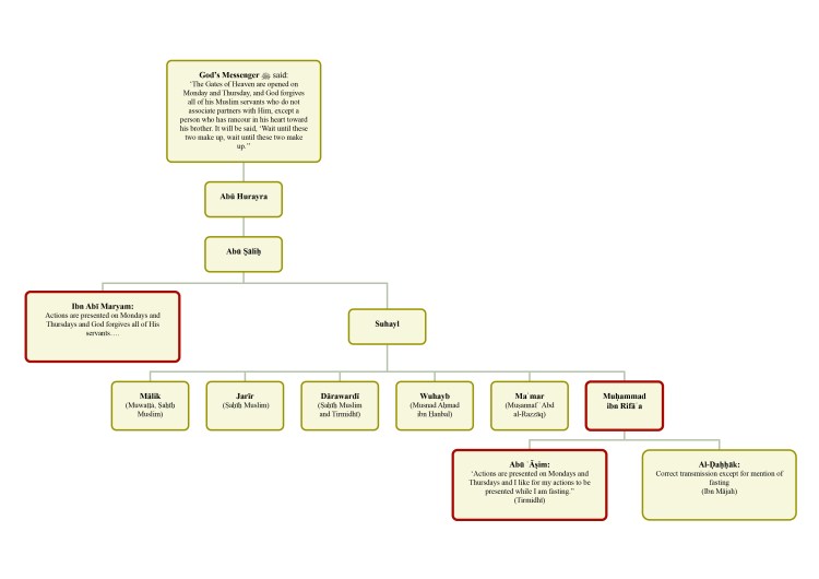 - The hadith was passed down from Abū Hurayra to his student Abū Ṣāliḥ al-Sammān, who passed it down to his son Suhayl ibn Abī Ṣāliḥ. Five students narrated it from Suhayl without mention of fasting: Mālik, Jarīr and ʿAbd al-ʿAzīz al-Dārāwardī (all in Ṣaḥīḥ Muslim), Maʿmar (as narrated in Muṣannaf ʿAbd al-Razzāq), and Wuhayb (as narrated in Musnad Aḥmad) Only one student of Suhayl narrated it with the addition of the mention of fasting, and he is the weakest and least reliable of them all : Muḥammad ibn Rifāʿa (as found in Tirmidhī and Ibn Mājah). Here Tirmidhī is saying that this wording is shādh (anomalous), which is one of three ways he used the term gharīb as explained at the end of his book. Those who rely on the definition of gharīb in books of Hadith Terminology would likely miss what he meant here.